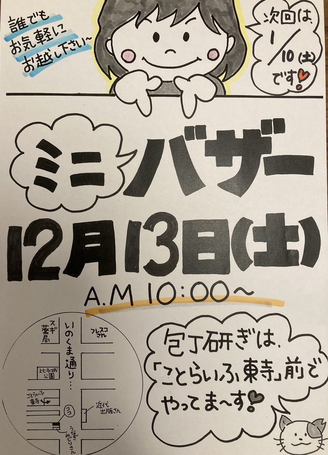 12月に入り、今年も残りわずかとなりました。この一年、地域のみなさまに温かく支えていただき心より感謝申し上げます。いよいよ年末のラストスパートの時期ですが、ミニバザーで少しほっとできる時間を過ごしていただければ嬉しいです❣️今年最後のミニバザーで小さなお宝ゲットして、ピカピカの包丁で新しい年を迎えてねぇ〜✨どうぞお気軽にお越しください♪